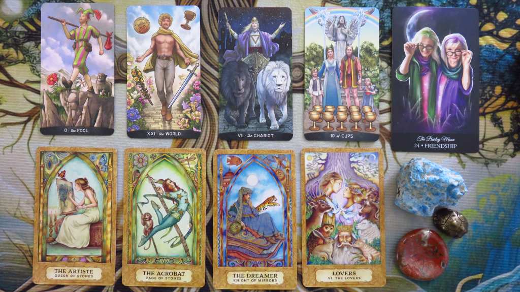 And so the focus was on the material world–how to make this human existence work on a day-to-day basis. But now we’ve grown a bit. We are now The Artiste. But this artist is also the Queen of Stones, with stones again representing our earthly life. And she has everything she needs to survive.