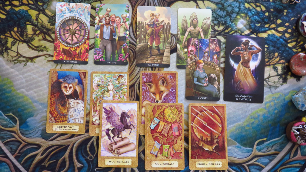And so now we are at the end of your recent past. And we have the Celtic Owl, which, in other decks, translates to The Hanged Man. The Hanged Man is someone who is pausing to look at things from a different perspective, like an owl. The owl will sit in the tree and wait for opportunity to come by. And when serendipity makes its appearance, the owl will shift perspectives several times before moving from the tree.