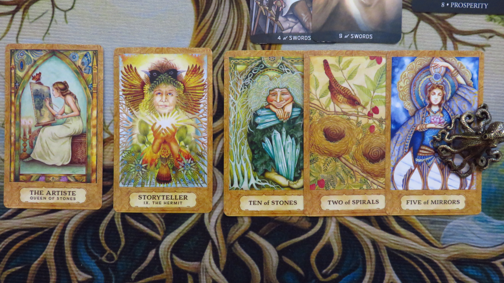 And so let’s look at the bottom set of cards, first. And let me lay those out for you. And so we’re going to start reading from the right and go toward the left. So the first card will be where the octopus is. This is your recent past.